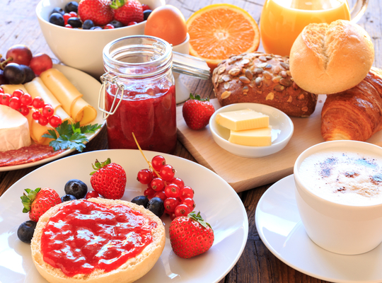 • uitgebreid broodassortiment met sandwiches, croissants, pistolets, wit brood, meergranen brood, volkorenbrood, diverse mini-broodjes